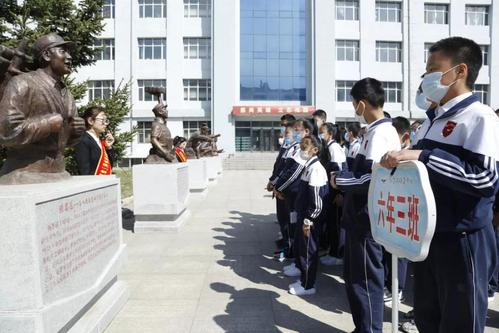 ▲哈尔滨顺迈学校中学生在“全军十大英模”塑像区研学